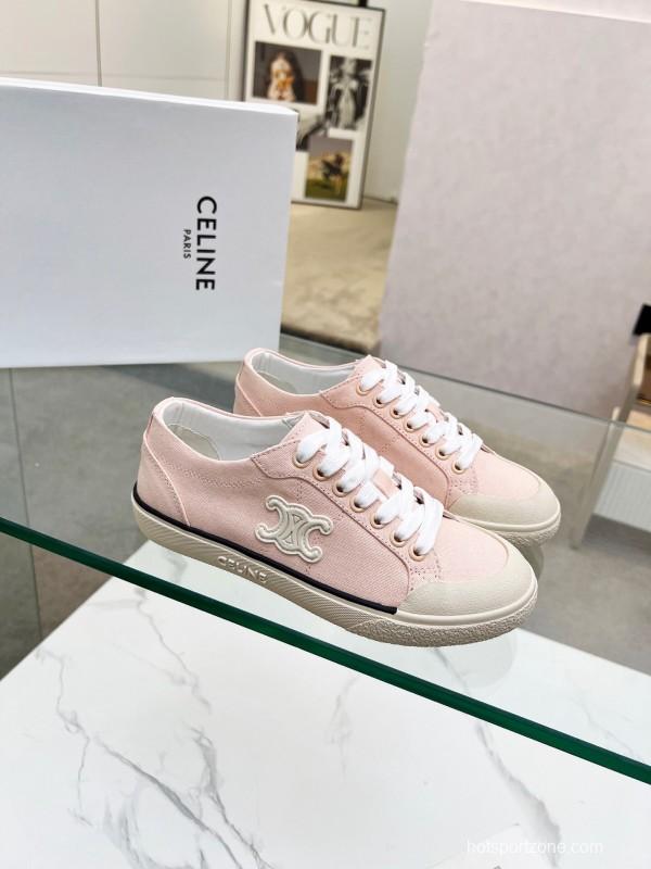 The 2025 Women Celine Pink Canvas Sneakers combine a chic design with practical features, making them ideal for casual everyday wear. These sneakers showcase the brand's iconic Triomphe rubber patch on the side, enhancing brand recognition and style. Its durable canvas upper ensures breathability and comfort throughout the day, while the wave-patterned outsole provides excellent traction and durability.