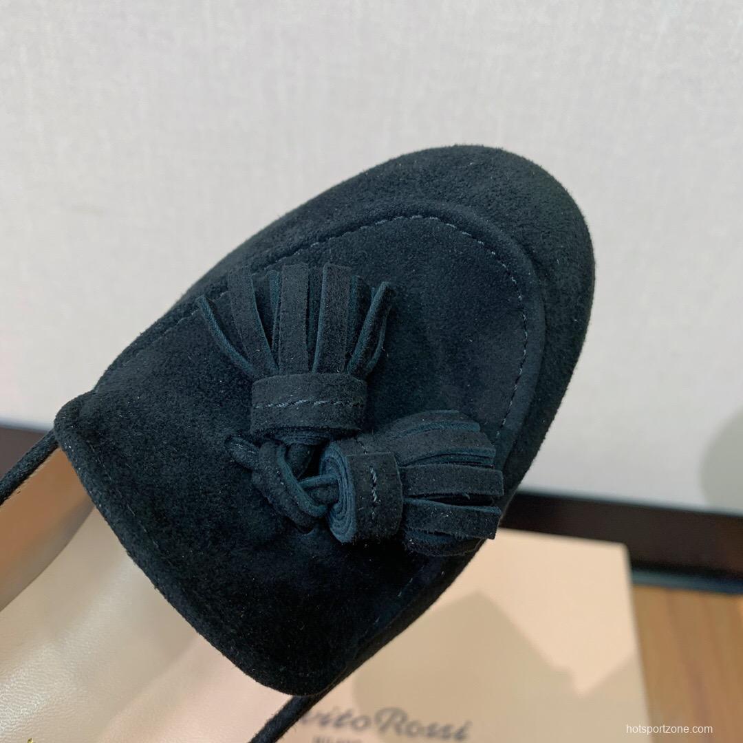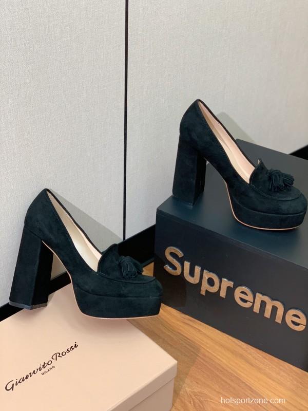 The 2025 Women Gianvito Rossi Black Suede Platform Tassel Loafer features a simple yet distinctive design, perfectly embodying a timeless style. Crafted with a soft suede upper and genuine leather lining and insole, this shoe offers comfort and durability. The platform enhances height with an 11.5cm heel and a 3.5cm water platform, making these loafers ideal for elegant casual or formal occasions.